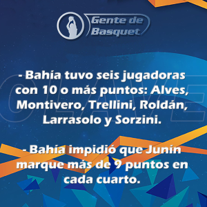 Bahía Blanca 104: Juana Montivero 15; Julia Quinteros 2; Catalina Salvo 7; Renata Vasconcelo 3; Delfina Alves 21 (F.I.) Isabella Larrasolo 11; Isabel Sorzini 10; Paloma Fernandez 5; Sofía Trellini 13; Isabella Roldán 11; Julieta Vogel 6; Yazmín Puentes. DT: Julián Manqueo.