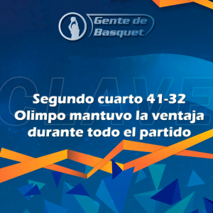 En el segundo cuarto, Olimpo reaccionó con ataques mas rápidos y precisos, contando con la presencia de Agustín Solomon con 6 pts y de Marcos Diel, con 5 pts, mientras que el equipo visitante tenía a Carlos Balmaceda con 4 pts y Alan Pan, con 3 pts. El parcial terminaría 21-12, con el total 41-32 sobre el final del primer tiempo.